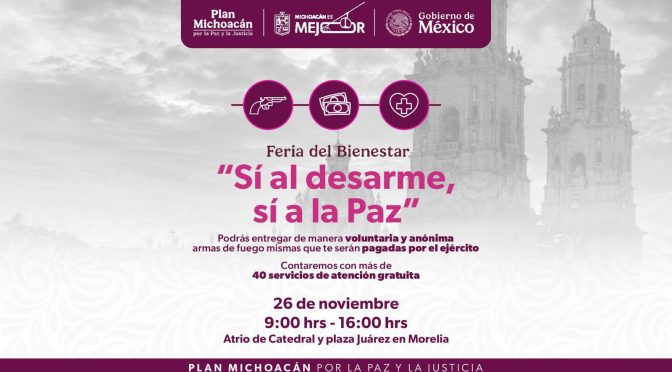 • Incluirá módulo de desarme voluntario; la ciudadanía podrá obtener un apoyo económico a cambio Morelia, Michoacán, 25 de noviembre de 2025.- Los gobiernos de México y Michoacán realizarán este 26 de noviembre la primera feria integral de servicios dentro del Plan Michoacán por la Paz y la Justicia, con la participación de más de […]